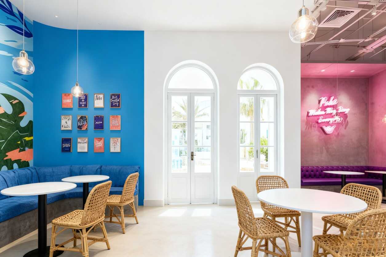 說真的他們家的軟裝搭配太懂了!簡約木質桌椅搭配暖黃色小吊燈,既有自然感又不失溫馨。***絕的是那個霓虹燈牌的設計,在粉色墻面上格外搶眼,隨手一拍都是ins風大片。綠植點綴得恰到好處,給整個空間注入了生機勃勃的感覺。