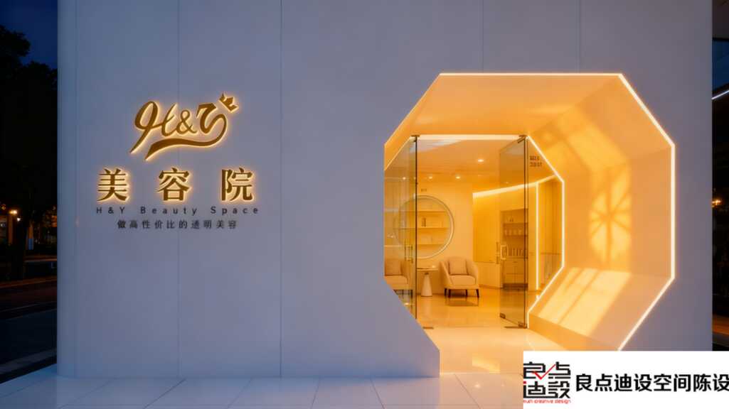 先從門頭說起吧。純白色極簡外墻,配上燙金質(zhì)感的“美容院”和英文標(biāo)識,那種高級感,瞬間就和街邊店拉開了距離。***吸睛的是它的門頭造型,不是那種方方正正的老套路,而是用了不規(guī)則的幾何切割設(shè)計,線條流暢又充滿現(xiàn)代藝術(shù)感。等到夜幕降臨,暖黃色的燈帶順著輪廓亮起,整個門面就像一件發(fā)光的雕塑,溫馨又格外抓人眼球。別說顧客了,我路過都忍不住想拍兩張打卡!這辨識度,在整條街上都是獨一份。